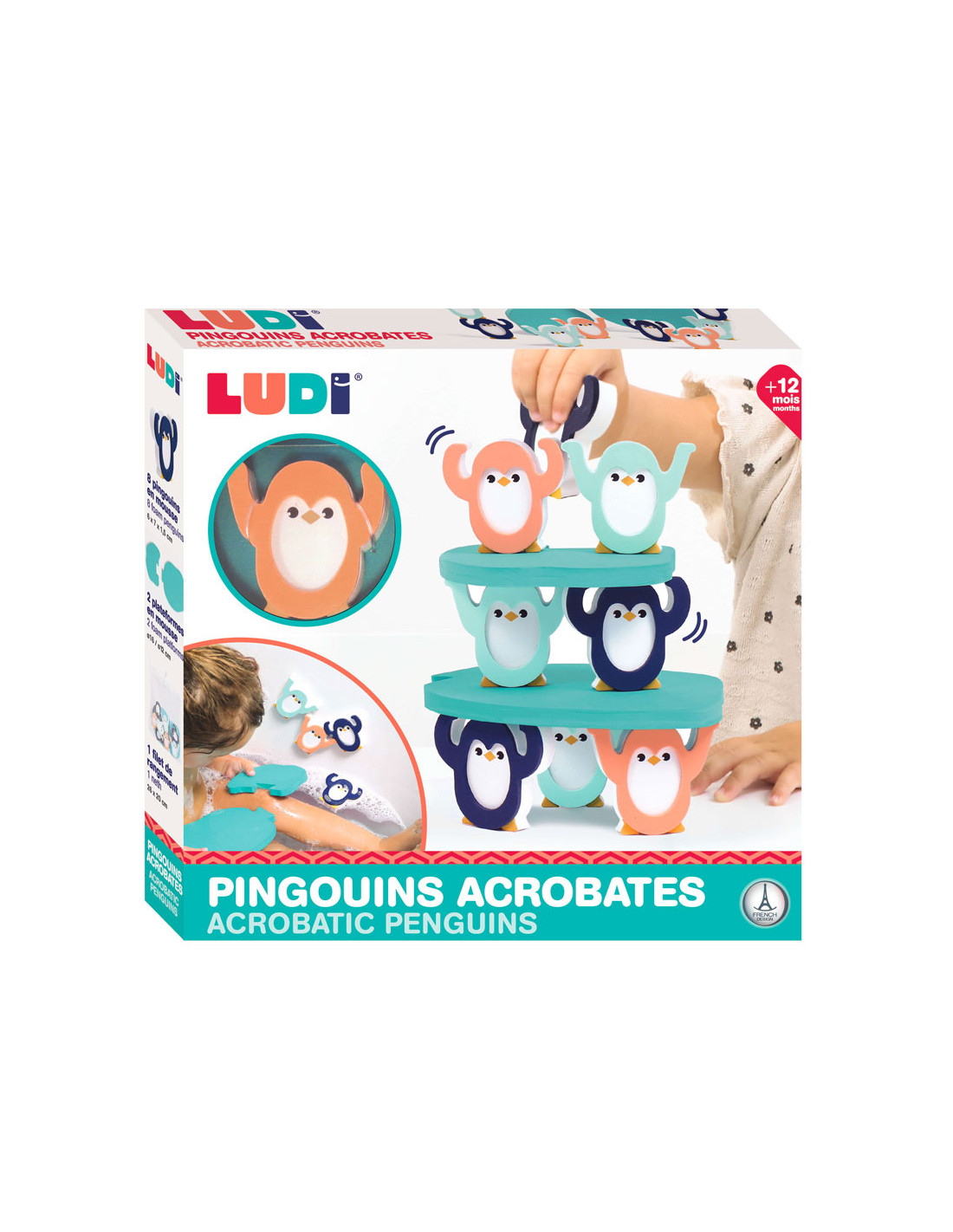 ¡Descubre 8 valientes equilibristas listos para tomar las posiciones más inverosímiles para entretener a los niños! Sólo tienen un límite: la imaginación. Este juego de equilibrio para 1ª edad desarrolla la concentración y la motricidad fina en niños a partir de 12 meses. Son posibles varias actividades: construir una pirámide con los dos témpanos de hielo, apilar los pingüinos uno encima del otro, instalar los personajes en una sola fila y luego hacer que todo caiga en fichas de dominó, etc.