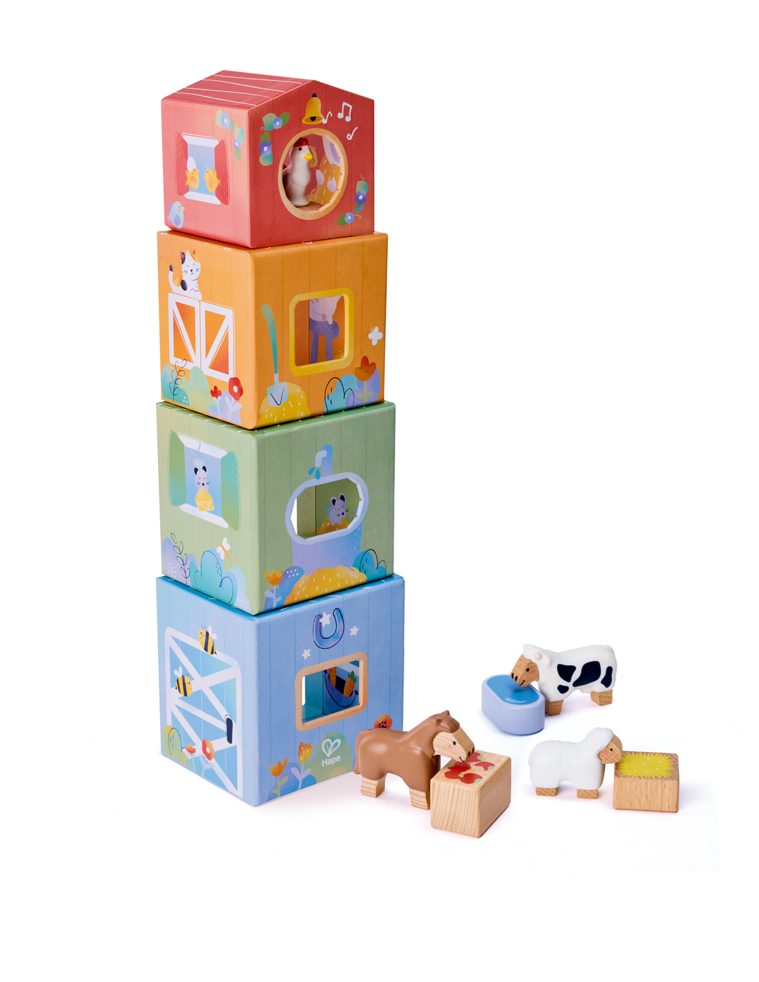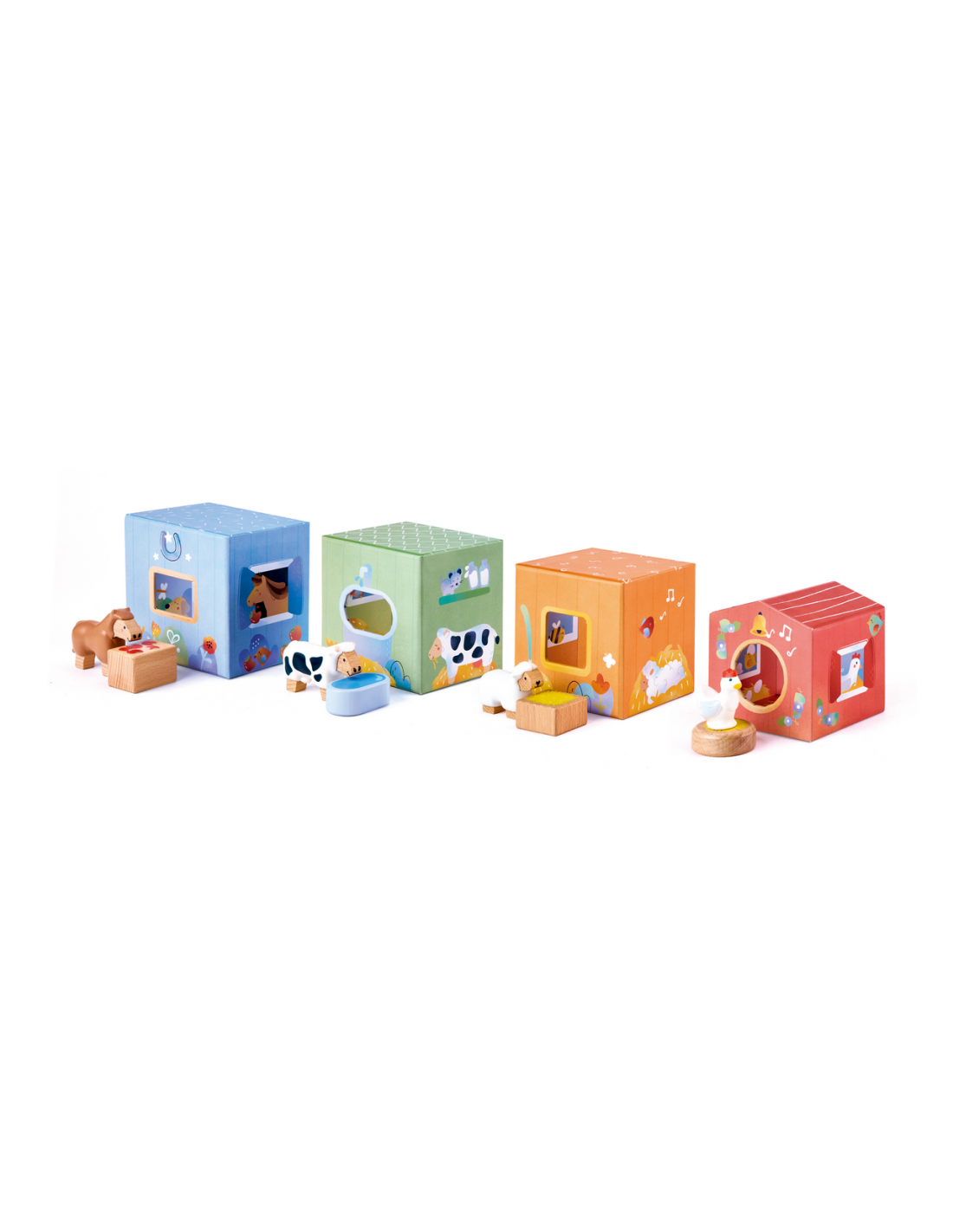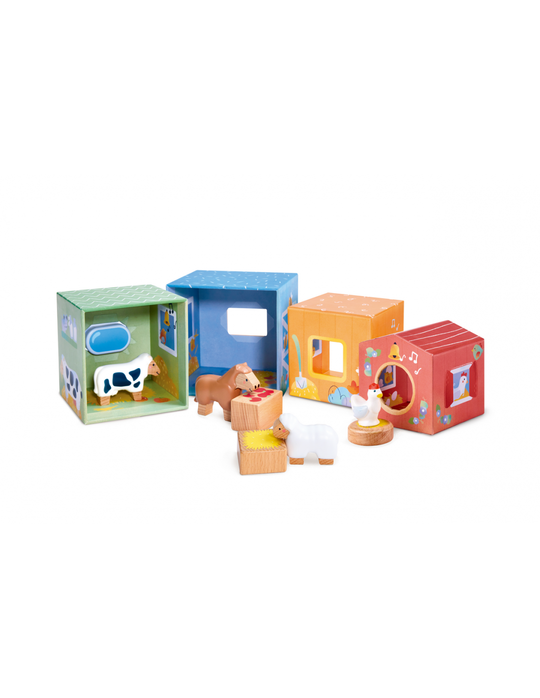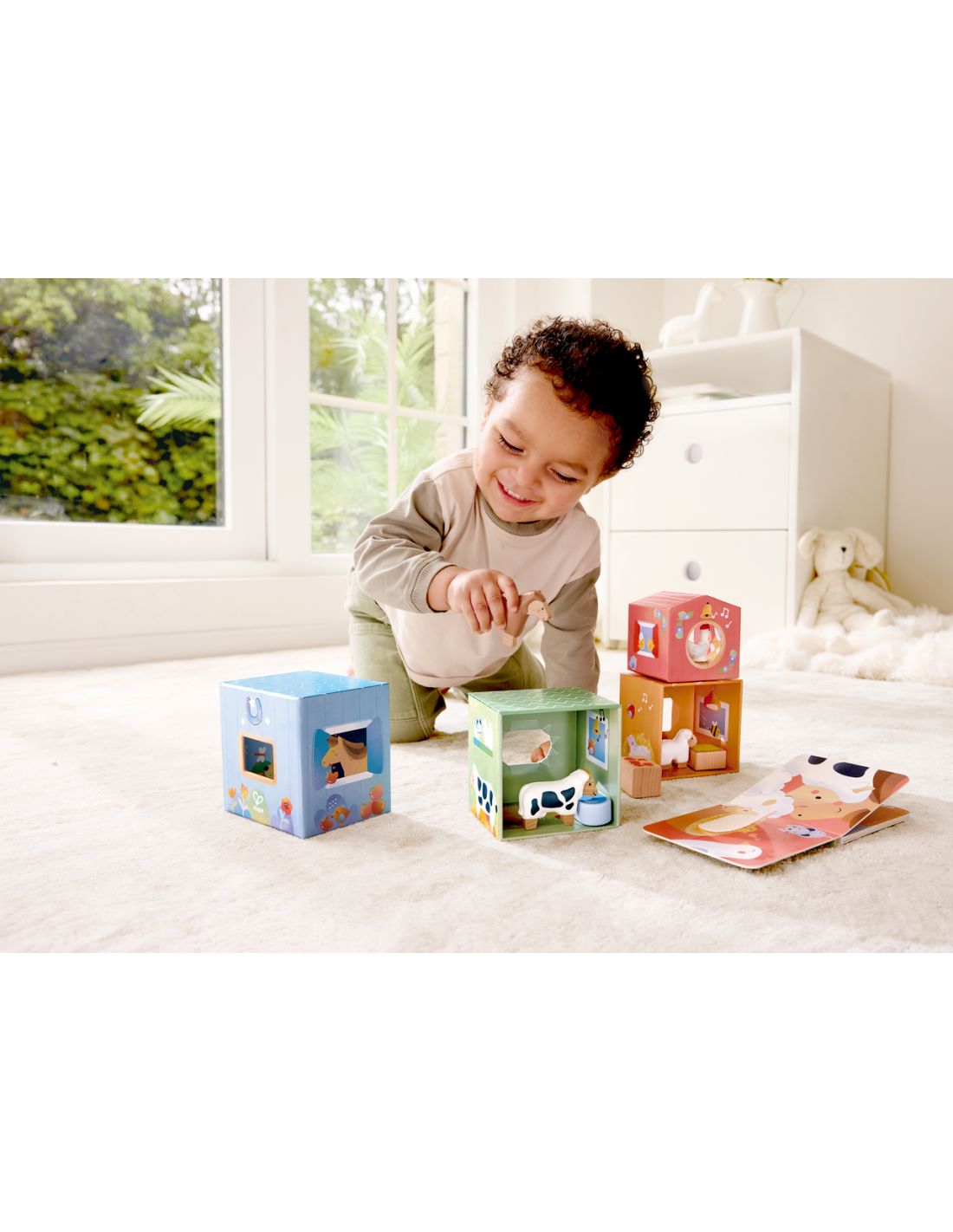 Un set de cuento y juego sobre la vida en la granja para despertar la curiosidad. Los alegres establos es un libro-juguete diseñado para inspirar el juego creativo a partir de una entrañable historia sobre la llegada de un nuevo habitante a los establos. Incluye un libro ilustrado, 4 cubos apilables con función de nido y clasificación, 4 animales de granja y accesorios. Después de leer el cuento, los niños pueden recrear la historia o imaginar nuevas aventuras, desarrollando habilidades como la coordinación, la creatividad, el lenguaje y la empatía. Los cubos permiten apilarse, ordenarse y combinarse de muchas formas distintas, lo que ofrece infinitas posibilidades de juego simbólico.