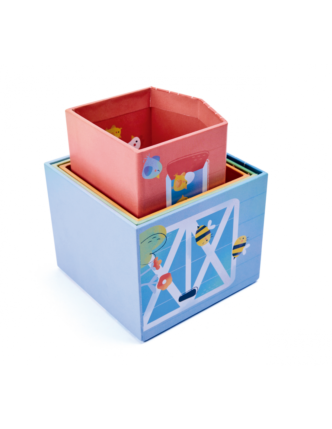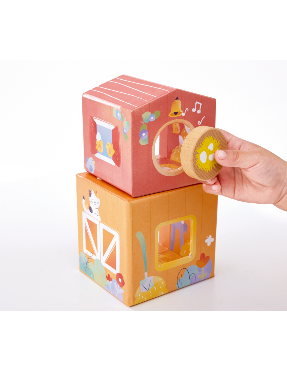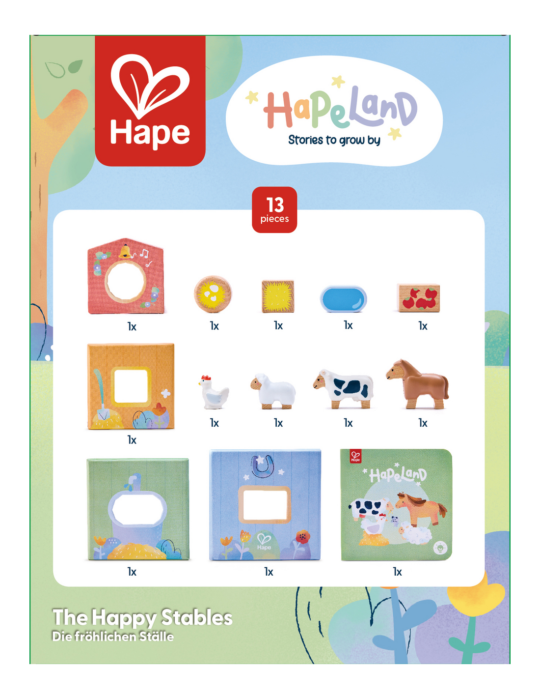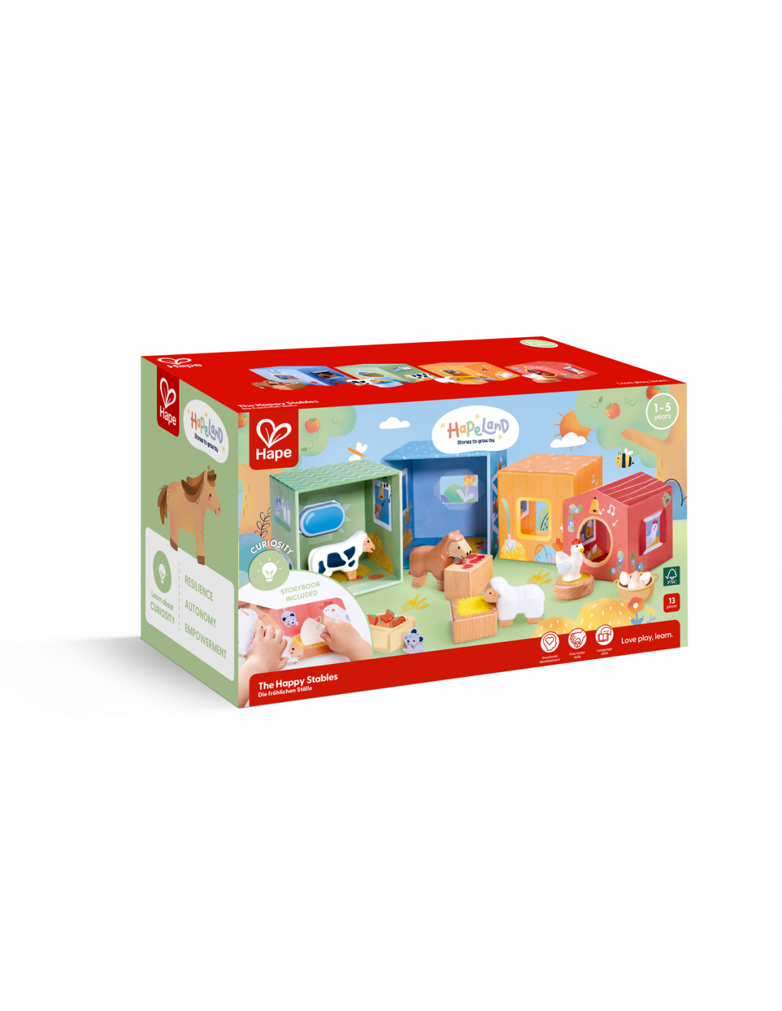 Un set de cuento y juego sobre la vida en la granja para despertar la curiosidad. Los alegres establos es un libro-juguete diseñado para inspirar el juego creativo a partir de una entrañable historia sobre la llegada de un nuevo habitante a los establos. Incluye un libro ilustrado, 4 cubos apilables con función de nido y clasificación, 4 animales de granja y accesorios. Después de leer el cuento, los niños pueden recrear la historia o imaginar nuevas aventuras, desarrollando habilidades como la coordinación, la creatividad, el lenguaje y la empatía. Los cubos permiten apilarse, ordenarse y combinarse de muchas formas distintas, lo que ofrece infinitas posibilidades de juego simbólico.