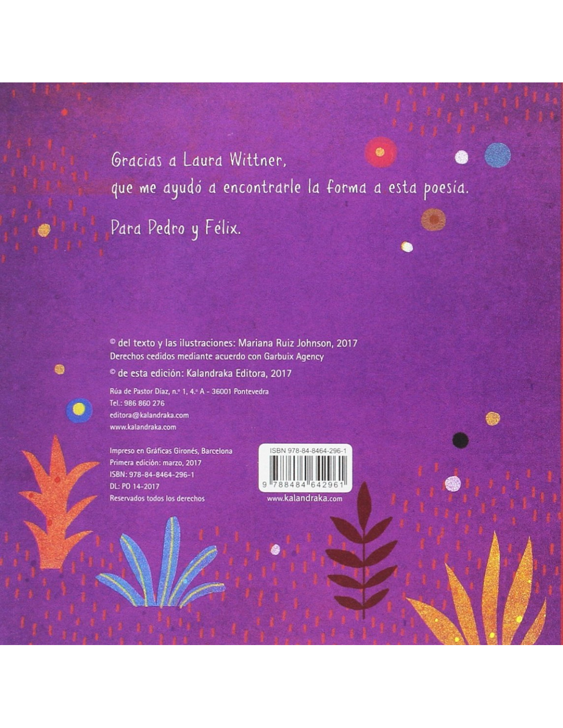 Andando por el camino, con maníes y aceitunas, venían mamá elefanta y su elefantita: Una. Por el camino es un poema infantil que desprende alegría y musicalidad. Está protagonizado por distintos animales, desde elefantes a ratones, bichos y osos, que marchan al ritmo de los versos octosílabos, marcando una progresión numérica. Así, del 1 al 10 se van sumando personajes hasta llegar a un sorprendente y festivo destino.